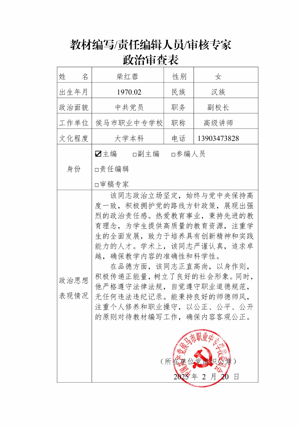 教材编写/责任编辑人员/审稿专家政治审查表