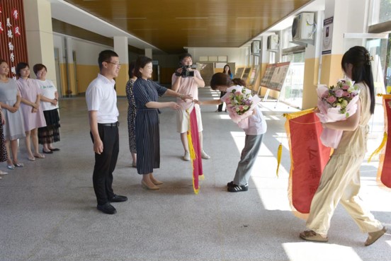 三载辛勤耕耘,换得桃李芬芳。火热的骄阳,挡不住家长感激之情;锦旗和鲜花,表不尽学子的感恩之意。7月26日上午,我校优秀毕业生郭一灿、杨鸿雨、贾云轩、任鹏飞、孙嘉朋五位同学及家长为学校送来锦旗和鲜花,由衷地感谢学校对孩子的关怀和培养。校党委书记郝红宇、副校长柴红蓉、副校长刘宏茂、高三年级主任毕国胜、班主任李静、车晗、范瑞和代课教师参加了欢迎仪式,郝书记、柴副校长、刘副校长代表学校接受锦旗,并同班主任、代课教师一起与家长和学生进行了愉悦、轻松地交谈。