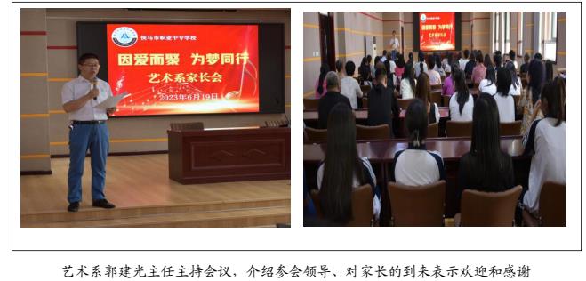 参加家长会的有副校长柴红蓉、政教主任李军旗、艺术系教师、82名学生家长及全体学生。会议由艺术系主任郭建光主持,“因爱相聚、为梦同行”,会议分三个环节8个议程进行。